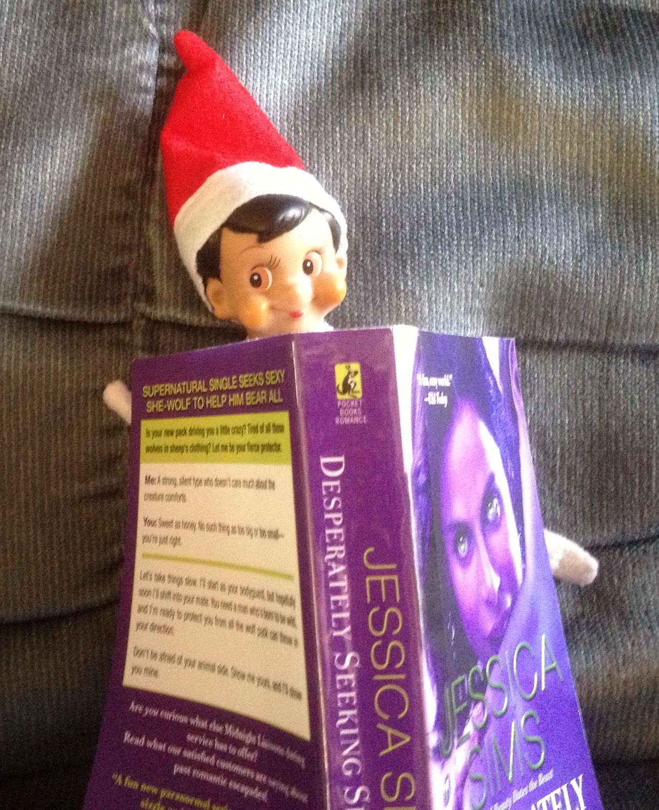 Elf on the Dirty Girls’ Shelf – Elf Inspiration Posted on December 4, 2012June 20, 2014 by Dirty Girl Anne I found the elf reading this morning. Desperately Seeking Shifter by Jessica Sims. He’s got good taste in books! Share this: Share on X (Opens in new window) X Share on Facebook (Opens in new window) Facebook Like Loading... Related