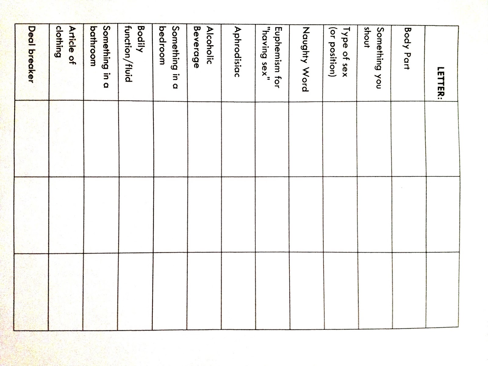 You roll the Scattegories die and use the letter.  Start the time and fill out the column on the answer grid.  You get a point for any answer no one else has.  As with the regular version, this one is more fun if you work in small teams of 2-3 people.  We laughed so much with this one and argued over acceptable answers, many of which needed explanations.  After someone (ahem) was accused at being able to work “cock” into the answers no matter what letter was rolled, this game ended with the now legendary Alphabet of Cock.  A – Amazing Cock.  B – Beautiful Cock, etc.